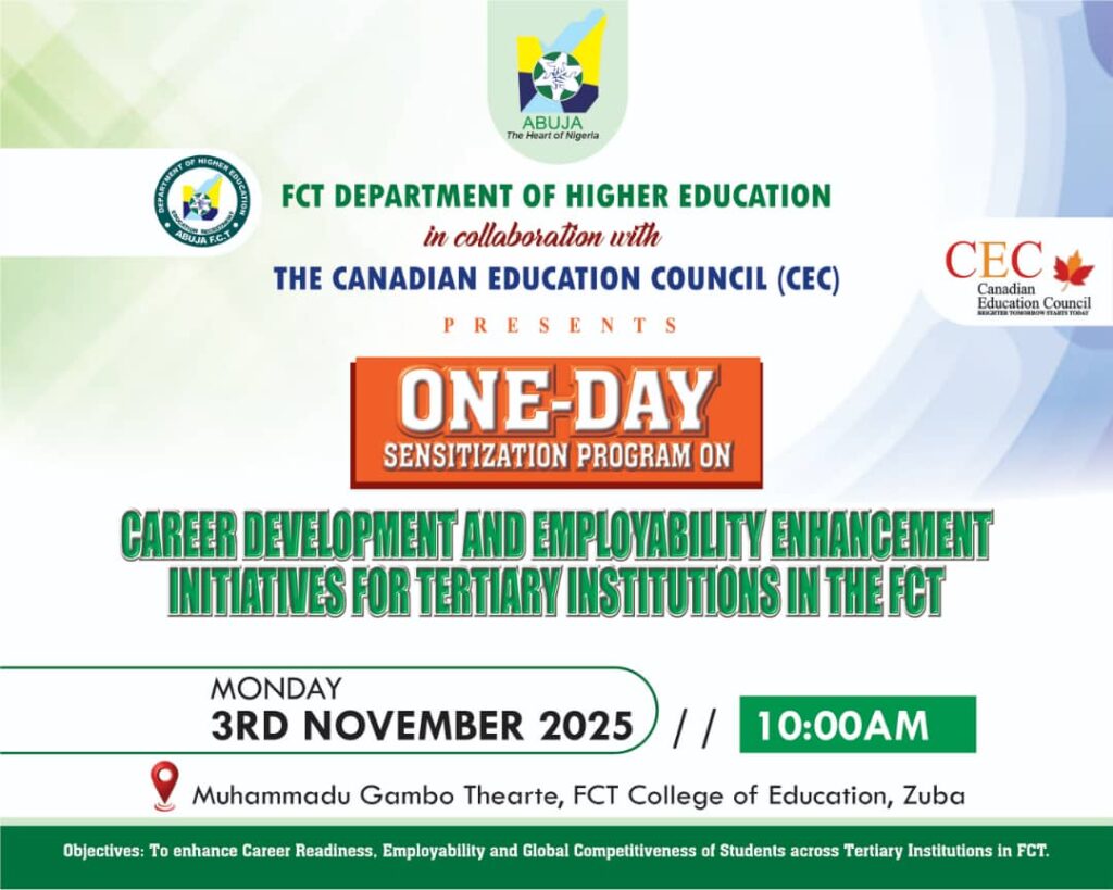 To tackle graduate unemployment and bridge the skills gap in Nigeria’s capital, the Federal Capital Territory (FCT) Department of Higher Education has partnered with the Canadian Education Council (CEC) to launch a sensitisation programme on Career Development and Employability Enhancement Initiatives.