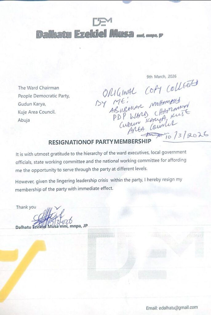 Hon. Dalhatu Ezekiel Musa has officially announced his resignation from the People’s Democratic Party (PDP), citing the prolonged leadership crisis within the party as the major reason for his decision.