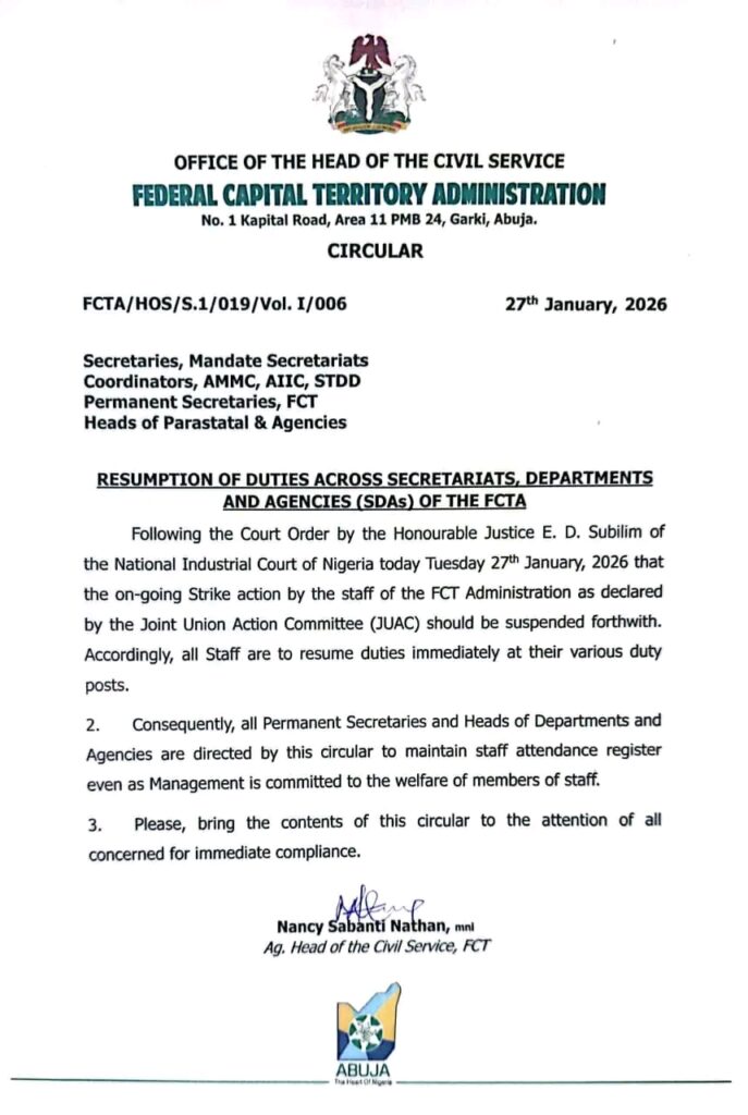 The directive was issued in an official circular dated Tuesday, January 27, 2026, by the Office of the Head of the Civil Service of the FCT. The circular cited an order of the National Industrial Court of Nigeria, presided over by Honourable Justice E. D. Subilim, which directed that the strike action declared by the Joint Union Action Committee (JUAC) be suspended with immediate effect.