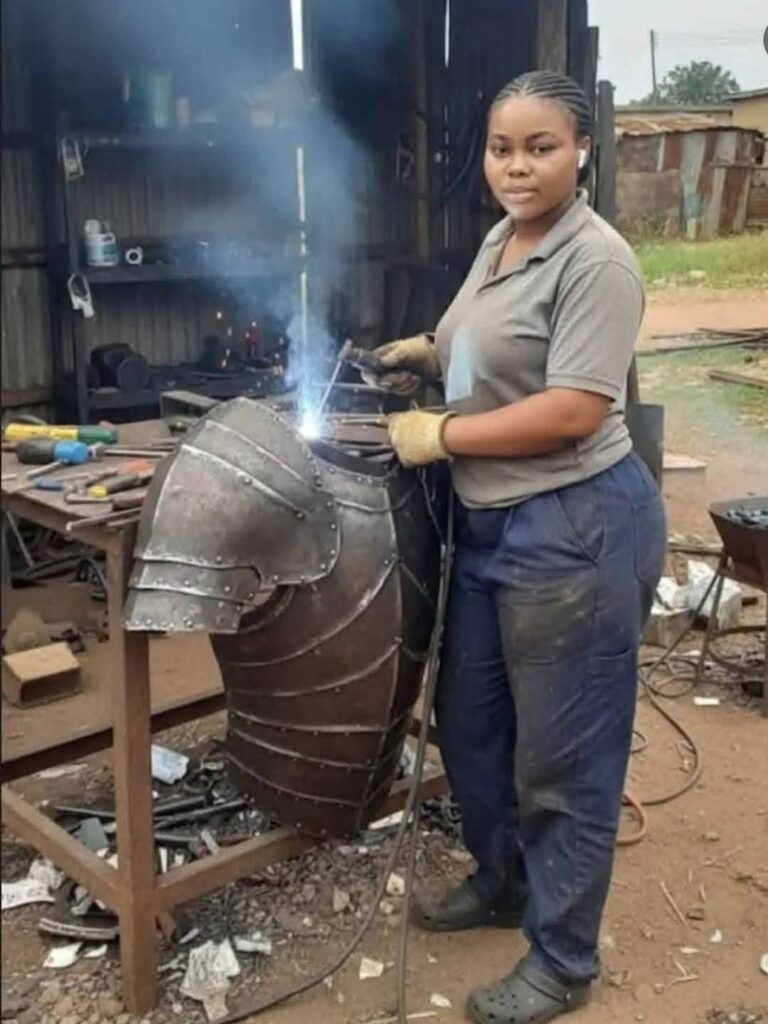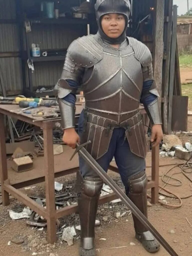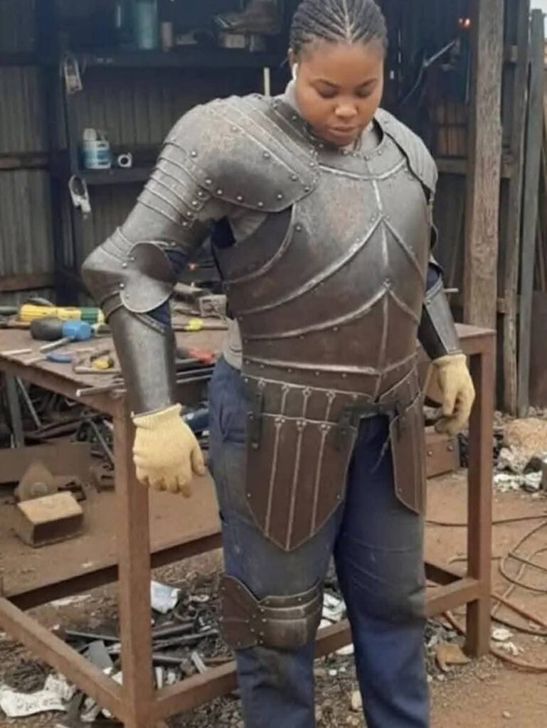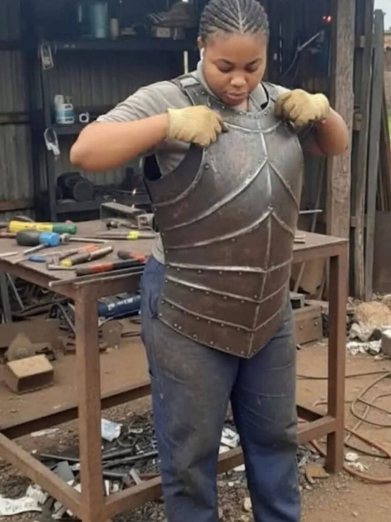 A Nigerian lady has gone viral on social media after unveiling a self-made “war armour” she claims to have welded in preparation for a rumored “US military invasion” of Nigeria.