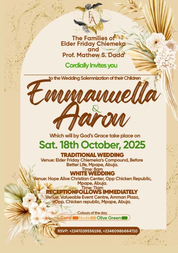 The families of Eld. Friday Chiemeka and Prof. Mathew S. Dada joyfully invite you to the wedding solemnization of their beloved children, Emmanuella and Aaron, which by God’s grace holds today, Saturday, 18th October, 2025.