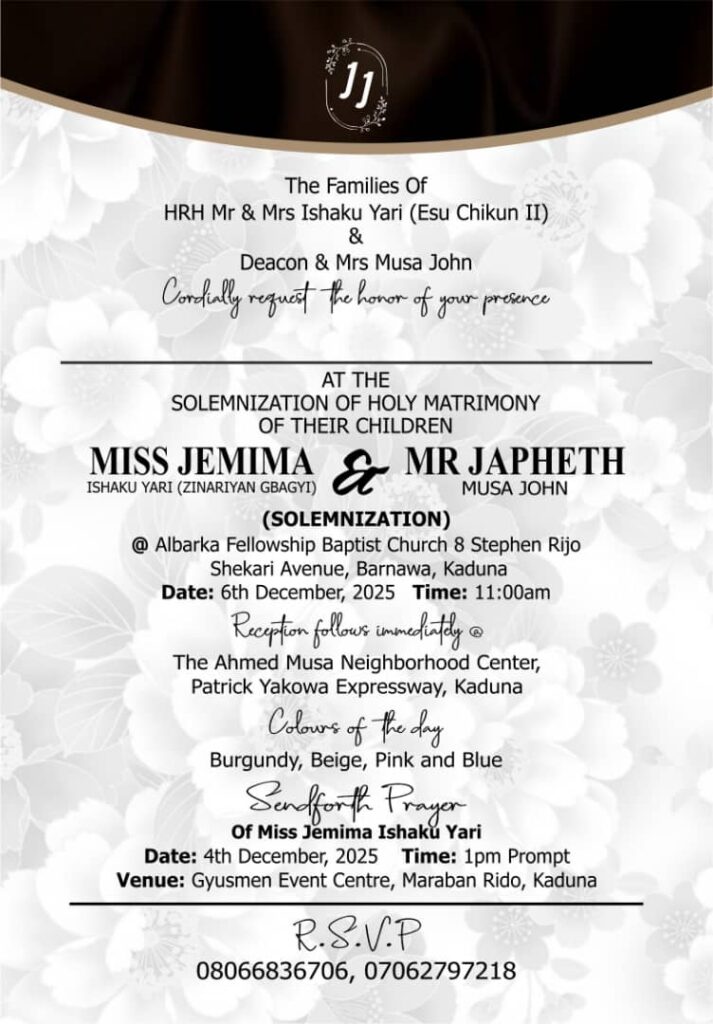 Ahead of the wedding, a Sendforth Prayer for Miss Jemima Ishaku Yari will be held on Thursday, 4th December 2025, at Gyusmen Event Centre, Maraban Rido, Kaduna, starting at 1:00 p.m. prompt.