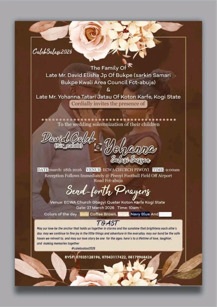 Ahead of the wedding ceremony in Abuja, a send-forth prayer session will also be held on March 27, 2026, at 10:00 a.m. at ECWA Church Gbaayi Quarter in Koton Karfe, Kogi State.