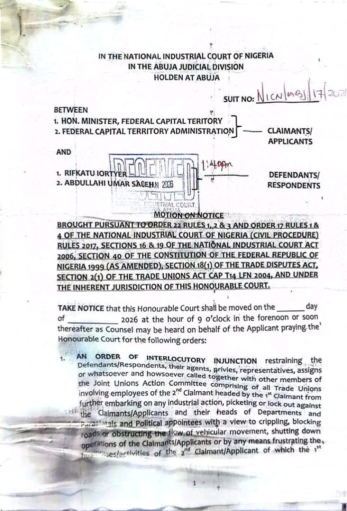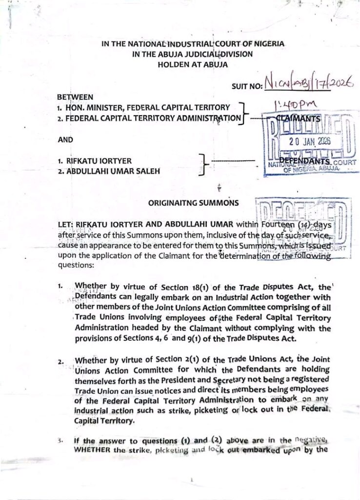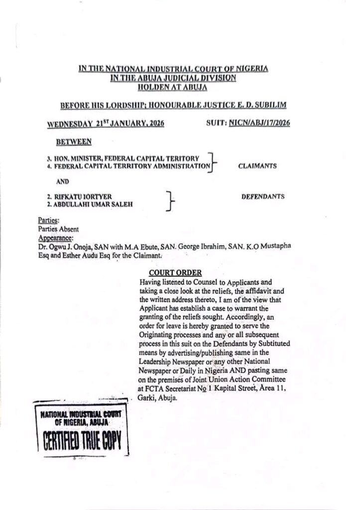 The court has granted substituted service for the unions and adjourned the case to January 26, 2026. Meanwhile, the unions have called for worker solidarity and maintained their stay-at-home directives, highlighting the escalating tensions between the FCT administration and public sector employees.